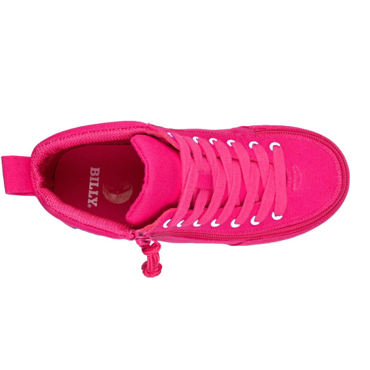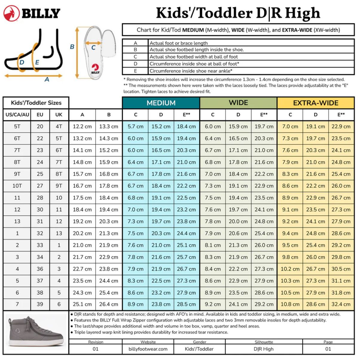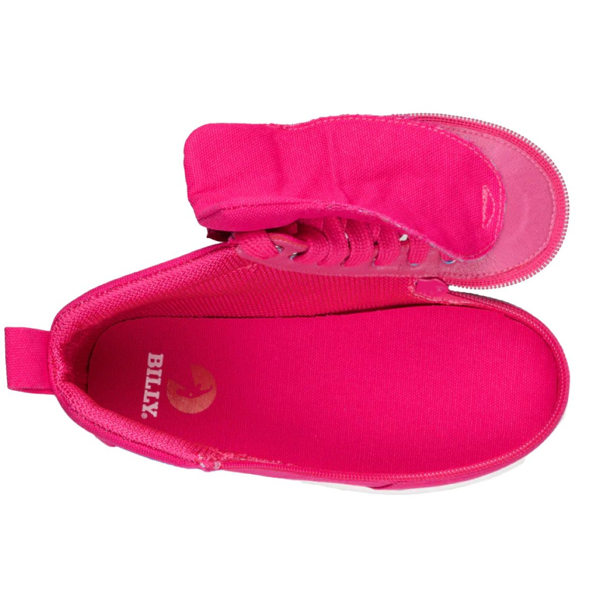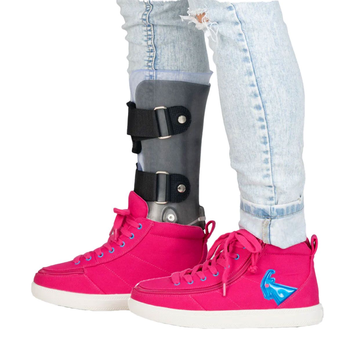 Billy Pink/Blue Light Ups Classic D|R High Tops Schoenen Speel, licht op, herhaal: de roze/blauwe lichtgevende BILLY Classic D|R High voor kinderen combineert vrolijke lichtjes met kindvriendelijk gemak. Gemaakt van canvas met een stevige gebreide voering voor comfort bij elke stap. Een rits rondom maakt ze gemakkelijk aan en uit te trekken, met veters voor extra pasvorm. Ze worden geleverd met twee uitneembare binnenzolen (elk 3 mm), handig voor het aanpassen van de diepte als je een brace of steunzool gebruikt. Verkrijgbaar in standaard (MDR) en brede (WDR) breedtes. Lichtjes activeren automatisch bij beweging.